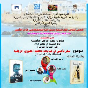 تحت شعار” من أجل إشاعة ثقافة المحبة والاعتراف” نظم الملتقی الثقافي لجمعیة أخراز للمحافظة علی التراث لکناوي بمدینة الصویرة أیام 20/19 نونبر2021 ” حيث نظمت ندوة تحت عنوان ” سفر تأملي حول کتابات فاطمة المعیزي الزجلیة أطرها کل من الدکتور عبد الإله الرابحي و الأستاذین بوشعیب الریاشي وسعید بوعیطة،تخلل ذلک توقیع لدیوان ” طویت الما” ” ودیوان وضفایر لالة”.