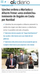 تفاديا لأي أقتحام مفترض من طرف المهاجرين نشرت صحيفة “أوكيدياريو” الإسبانية،في مقال لها أن بيدرو سانشيز رئيس حكومة إسبانيا توصل بتقارير تفيد وجود الآلاف من المهاجرين على مقربة من حدود سبتة، ينتظرون فرصة القيام باقتحام جماعي ، وأشارت ذات الصحيفة أن سانشيز أعطى أوامر خاصة لكل من وزير الداخلية فيرناندو غراندي مارلاسكا، ووزير الخارجية الإسباني خوسي مانويل ألباريس، بالعمل على تفادي أي أزمة جديدة في سبتة خلال الأيام المقبلة مع اقتراب احتفالات رأس السنة “الكريسماس”.
