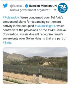 وقال بوليانسكي: “نحن قلقون من خطط تل أبيب المعلنة لتوسيع النشاط الاستيطاني في مرتفعات الجولان المحتلة، الأمر الذي يتعارض مع أحكام اتفاقية جنيف لعام 1949. لا تعترف روسيا بسيادة إسرائيل على مرتفعات الجولان التي هي جزء من سوريا”.