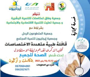 تعلن جمعية وفاق تمكاسلت للتنمية البشرية وجمعية تعليت للتنمية الاقتصادية والاجتماعية، عن تنظيمها حملة طبية متعددة التخصصات لفائدة ساكنة تمكاسلت وأركيون ، بشراكة مع جمعية المتطوعون الرحل وجمعية إيجابيون لتنمية المجتمع،وذلك ايام 12، 13، و14 يناير 2023.