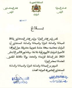 يخبر رئيس مجلس النواب ورئيس مجلس المستشارين كافة السيدات والسادة النواب والسيدات والسادة المستشارين أن البرلمان بمجلسيه سيعقد جلسة عمومية مشتركة حول المواقف الأخيرة للبرلمان الأوروبي تجاه بلادنا ، وذلك يوم الاثنين 23 يناير 2023 على الساعة الواحدة والنصف زوالًا بالقاعة الكبرى للجلسات بمجلس النواب.