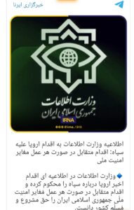 أكدت وزارة الاستخبارات والأمن الإيرانية، اليوم الأحد، أن الإجراءات التي اتخذها البرلمان الأوروبي ضد الحرس الثوري الإيراني عديمة المنفعة تحاول إحياء مشروع إثارة الشغب الأخير الفاشل، مشيرة إلى أن “هذه الأوهام لن تثمر”.