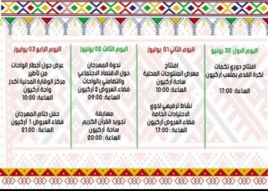 كما أن برنامج المهرجان حافل بأنشطة وفقرات مختلفة تشمل المجال الثقافي والفني والرياضي، وذلك من خلال تنظيم معارض ومسابقات وحملات توعوية وتحسيسية.بالإضافة إلى تنظيم دوري في كرة القدم بملعب أركيون، بمناسبة عيد الأضحى المبارك.