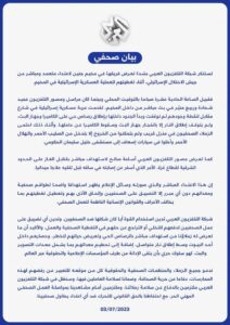 أصدرت شبكة التلفزيون العربي بياناً استنكرت فيه بشدة تعرض فريقها في مخيم جنين لاعتداء متعمد ومباشر من جيش الاحتلال الإسرائيلي، أثناء تغطيته العملية العسكرية الإسرائيلية في المخيم.